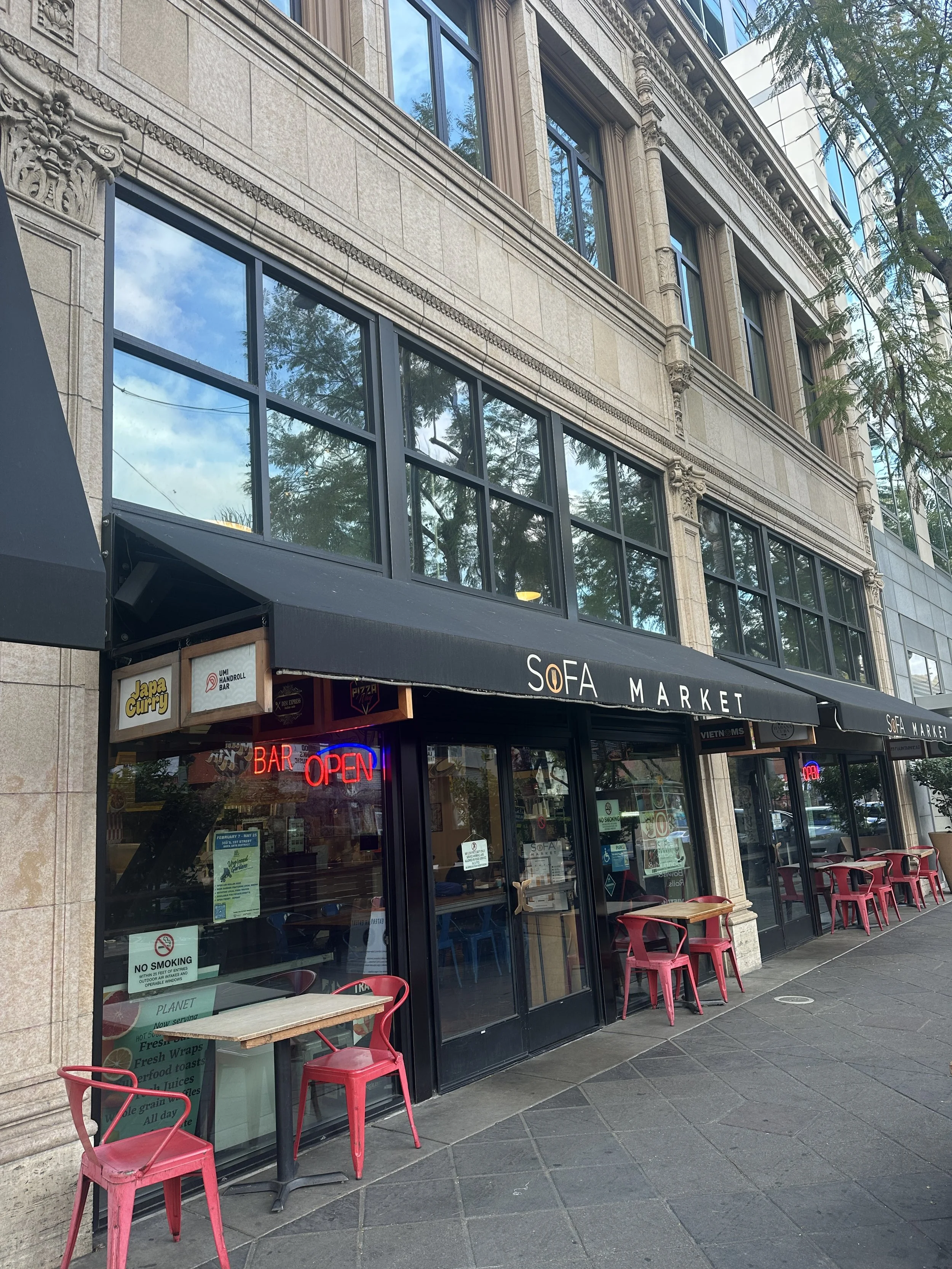 Exterior of a bakery or cafe called Sofa Market, with red tables and chairs outside, a neon bar open sign, and large windows reflecting trees and sky.